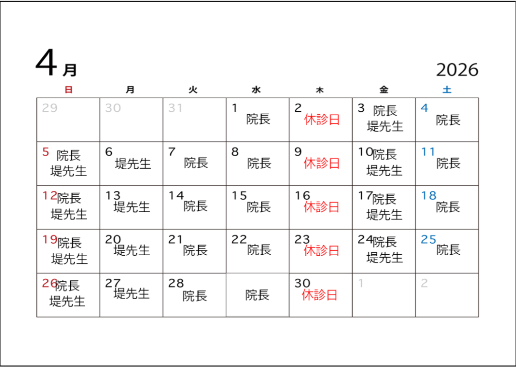 4月の獣医師出勤表です。